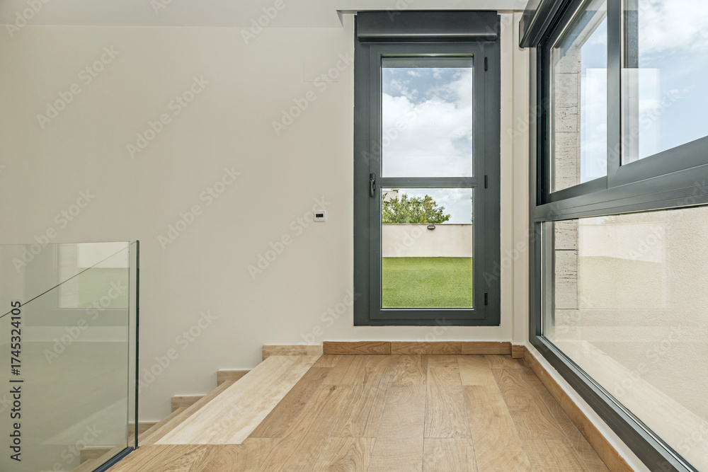 Hallway with a minimalist staircase and o walls creating a warm and inviting atmosphere
