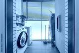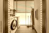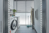Multifunctional space that combines a laundry area with a washer-dryer and boiler, plus storage cabinets
