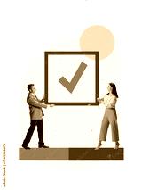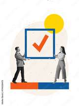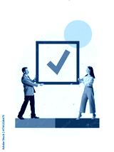 Trendy artwork. Business partners holding large checkbox symbolizing agreement and accomplishment. Concept of completion, validation, and teamwork for project management, HR, and corporate visuals.