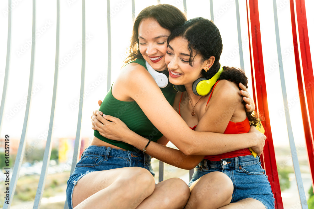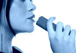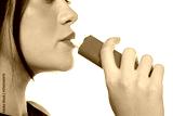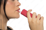 Closeup studio shot of young woman with dark hair holding red vape pen near lips on white background.