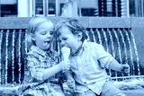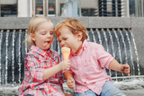 Group portrait of two white Caucasian cute adorable funny children toddlers sitting together sharing ice-cream food. Love friendship concept. Best friends forever.