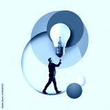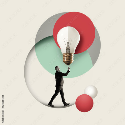 Surreal collage with businessman and light bulb symbolizing innovation, creativity, and new ideas. Modern abstract design for business, strategy, and success concepts.