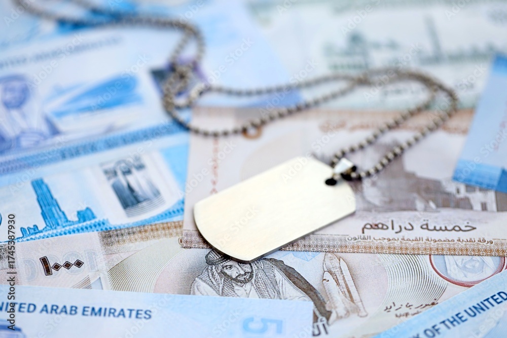 United Arab Emirates dirham currency money bills and military token. The concept of army service