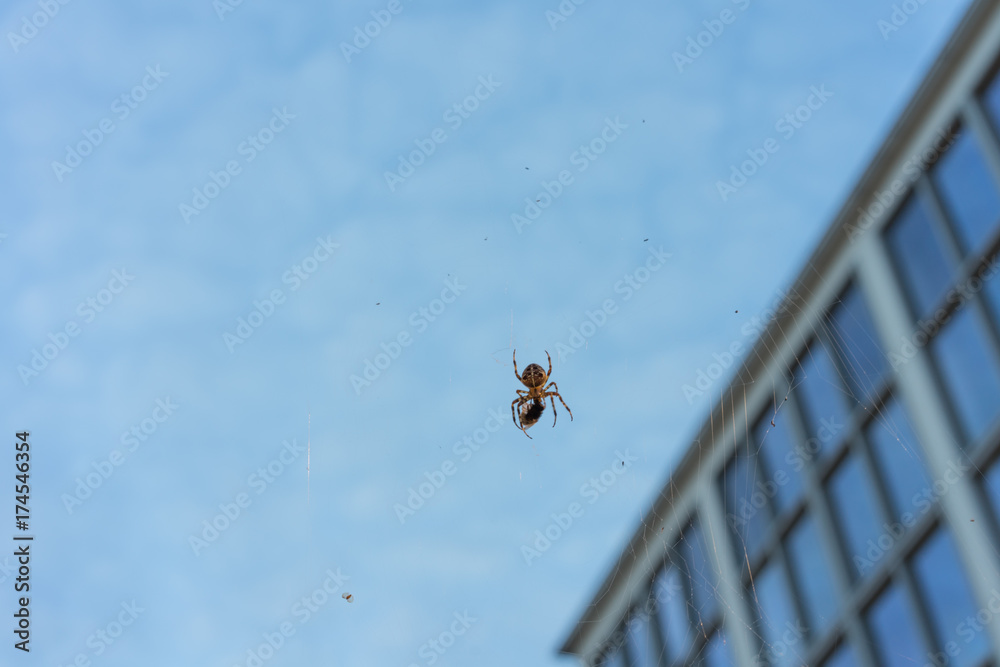 big spider in net with prey close up at evening night building in the background blue hour macro