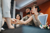 A group of colleagues enthusiastically shaking hands in an office, showing teamwork and mutual support while working together on a task.