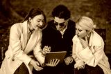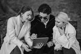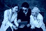 Three professionals collaborating and reviewing business information on a tablet outdoors.