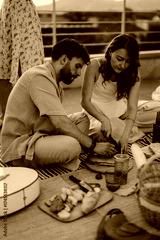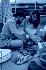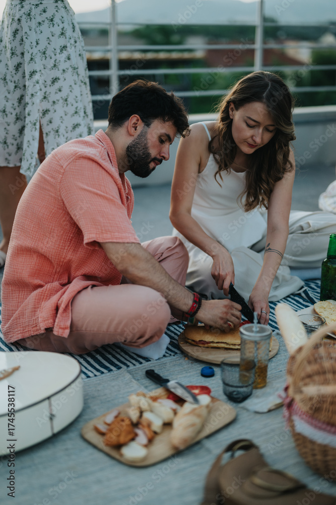 A cheerful group of friends enjoying an outdoor meal preparation at a rooftop event. Lively atmosphere with food, beverages, and thoughtful gestures among the attendees.