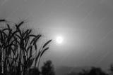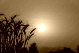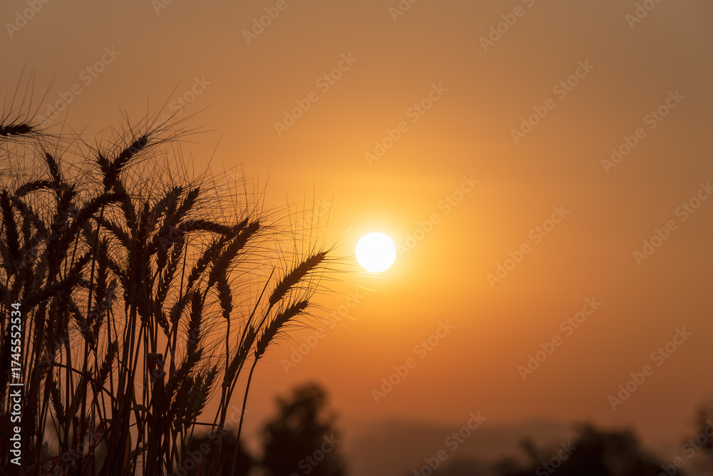 Warm sunset over ripe wheat field, golden light shining on grain ears, peaceful rural landscape and natural harvest season background