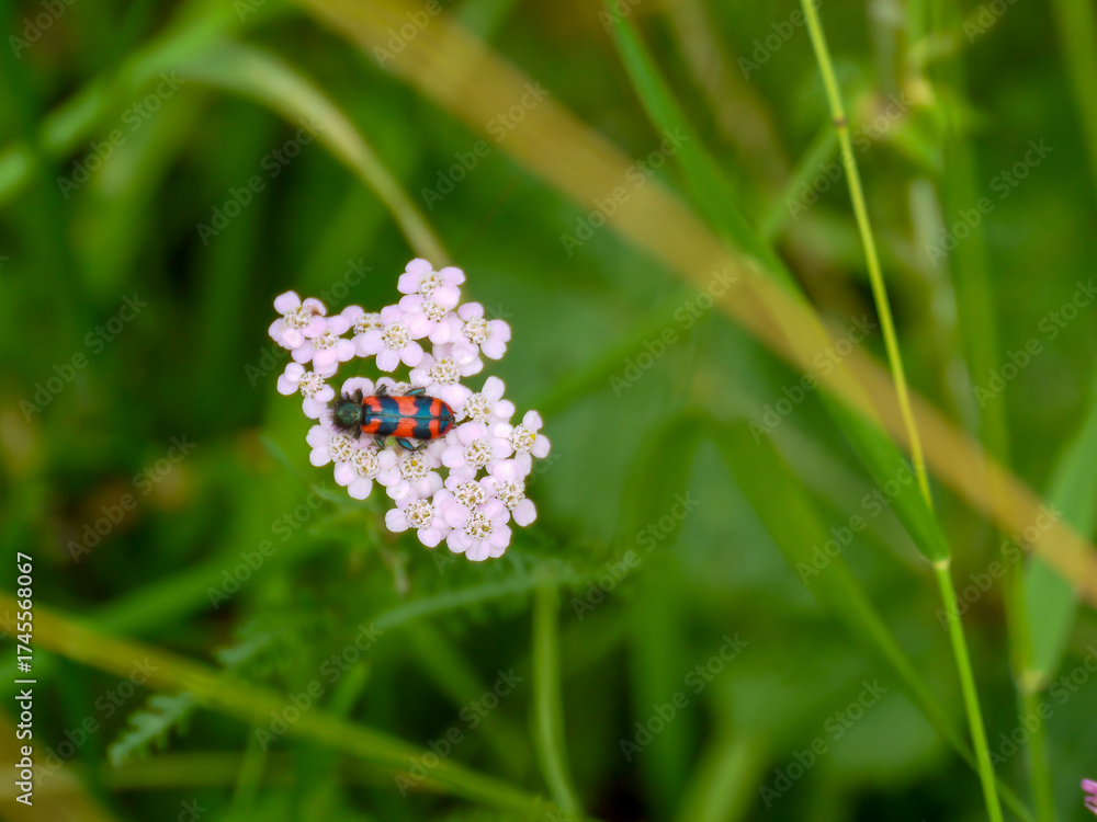 A shaggy bee beetle (Trichodes alvearius) photographed on a beautiful white flower in Musio, a district of Tremosine.