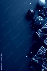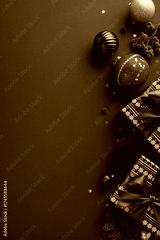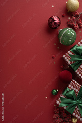 Colorful vertical Christmas decorations and wrapped gifts create a festive scene on a rich red backdrop with green and gold ornaments and berries, conveying warmth, joy, and festive New Year spirit