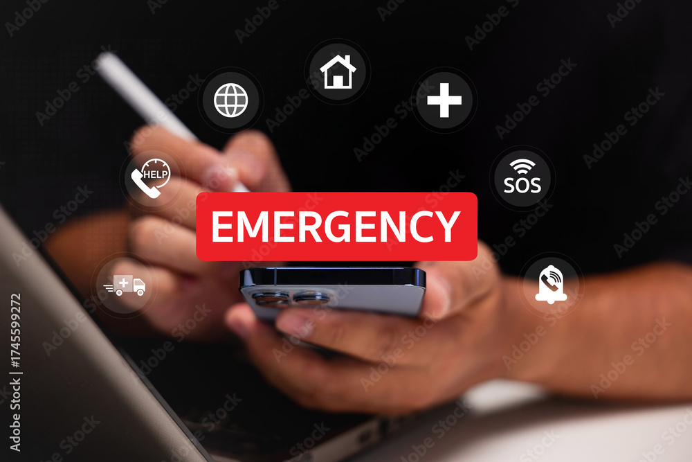 A hand using a smartphone displays emergency icons, emphasizing the importance of quick communication during urgent situations.
