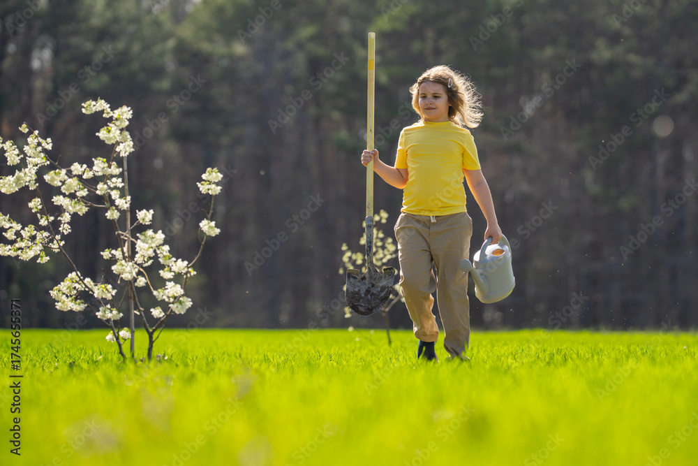 Kid working in garden. Growth tree and care plant in garden. Gardening season. Kid cultivating plants. Backyard gardening. Kid watering fruit tree on garden. Kid planting tree. Spring in garden.
