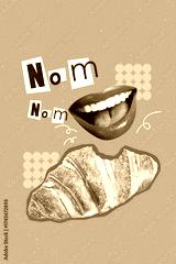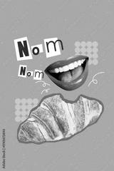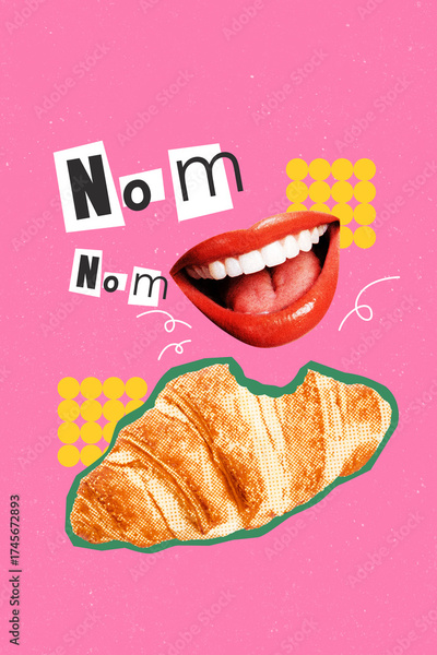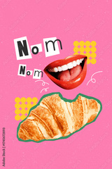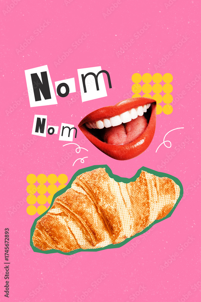 Pop art image poster 3d banner collage of happy faceless mouth bite puff dough croissant bakery nutrition bagel nom nom diet