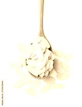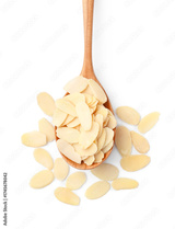 Fresh almond flakes in spoon isolated on white, top view