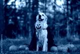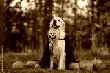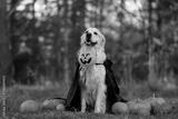 A dog in a witch costume with pumpkins for Halloween. A golden retriever is sitting in an autumn park, holding a festive bucket of pumpkin-shaped sweets in his mouth.