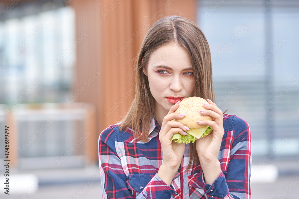 Young caucasian female enjoying a fresh burger outdoors wearing plaid shirt.