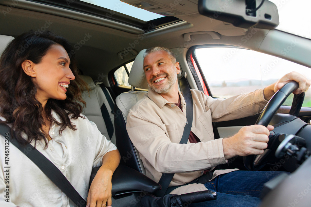 Excited European couple sitting inside brand new car, enjoying comfortable auto, looking at each other and smiling