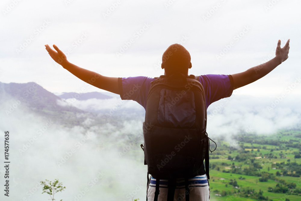 Freedom African climbers stand up at the top of the hill covered with mist.