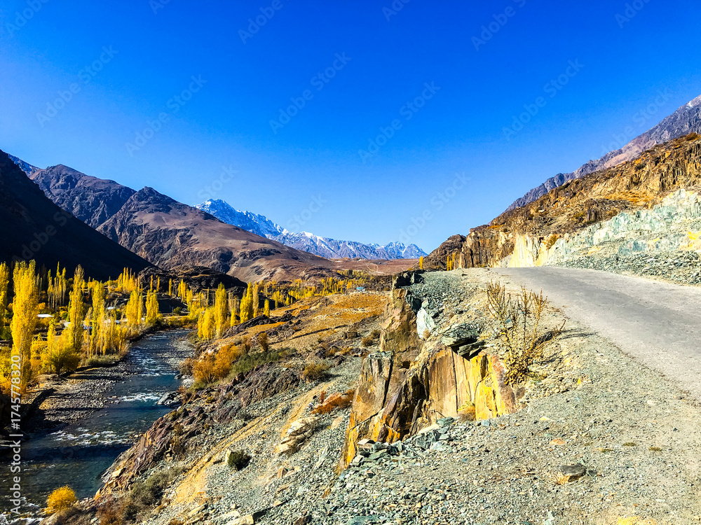 The road fades into a highland village, wrapped in the warm hues of Karakoram autumn along the Indus river