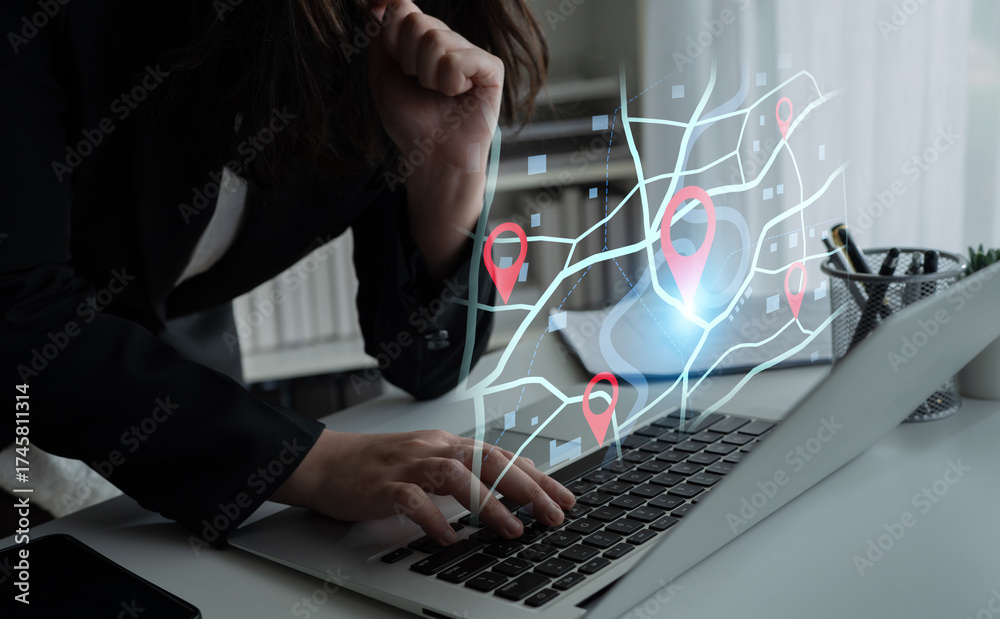 Concept of location tracking and GPS navigation. Map with pins marking a destination and points of interest for travel, delivery routes, or finding a specific address. Fermion