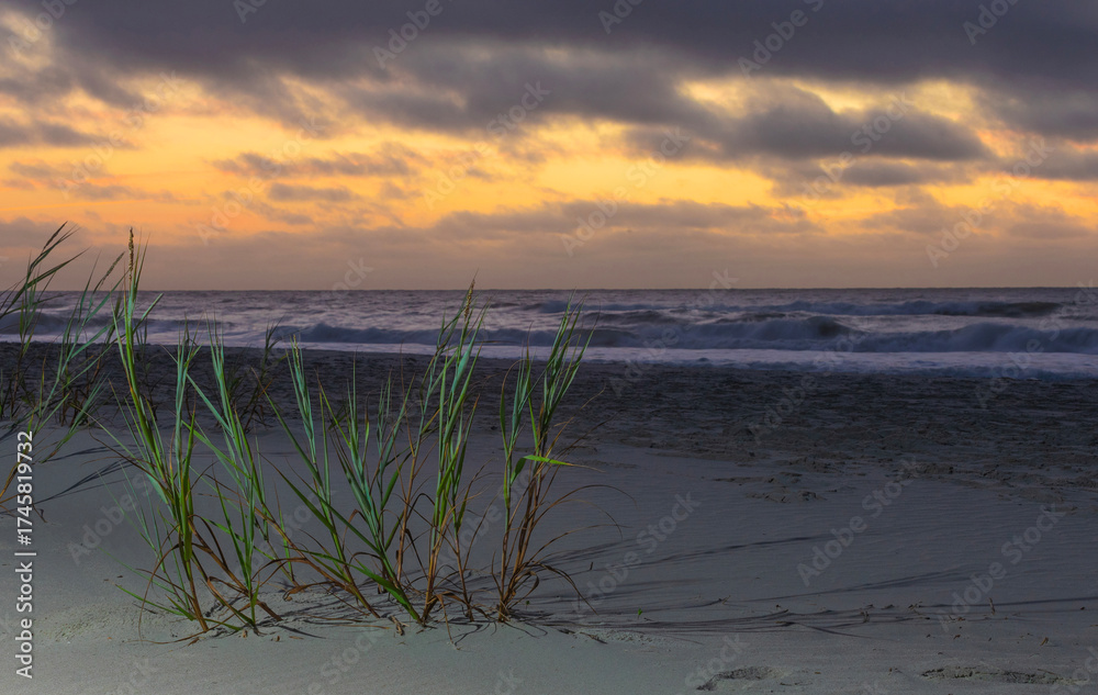Small plants growing on a beach with ocean waves at sunrise