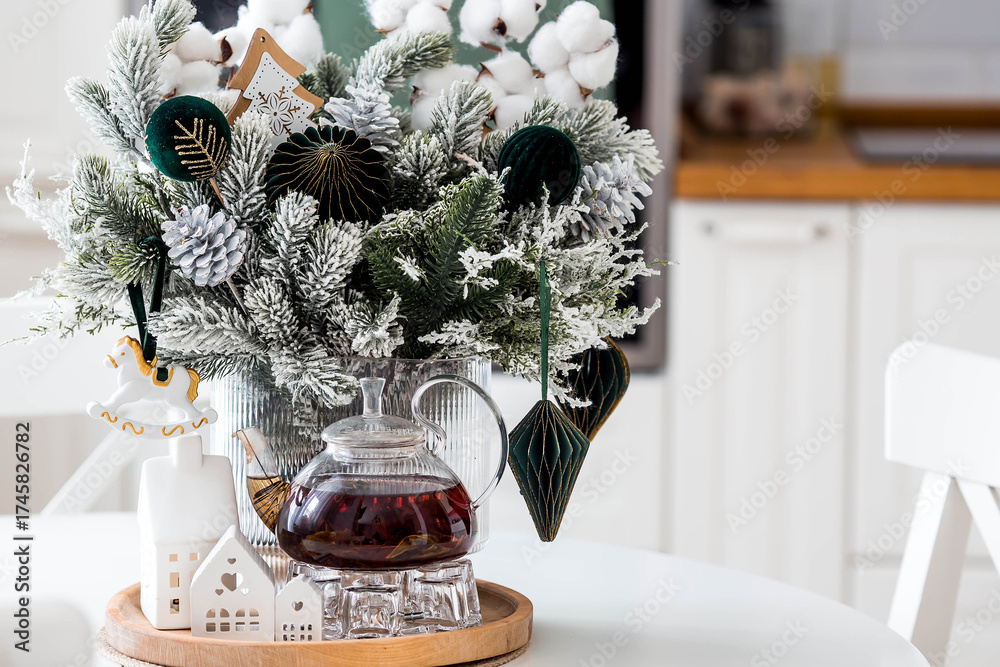 Concept of preparation and decorations for the New Year 2026. A spruce bouquet with green toys, horses, and white houses on the kitchen table. Christmas decorations in the interior.