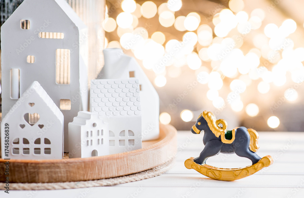 Concept of preparing for the New Year 2026. A horse and white houses on a table in the living room. New Year decor in the interior.