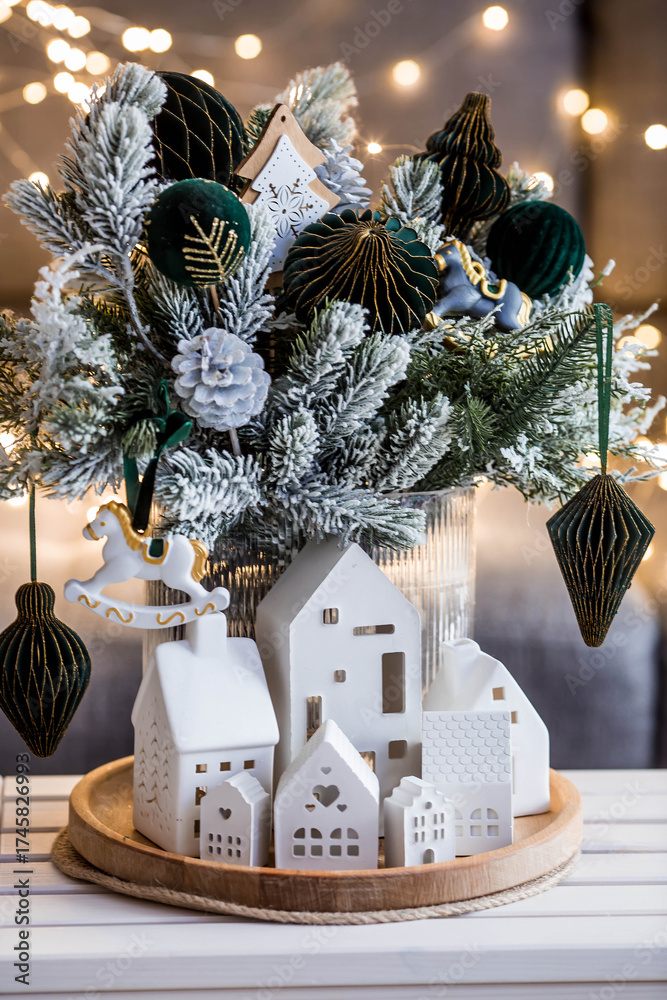 Concept of preparation for the New Year 2026. A spruce bouquet with green paper toys, horses, and white houses on a table in the living room. New Year decor in the interior.