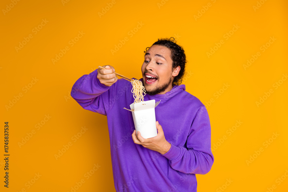 Young man enjoying takeaway noodles with chopsticks on yellow background in casual style