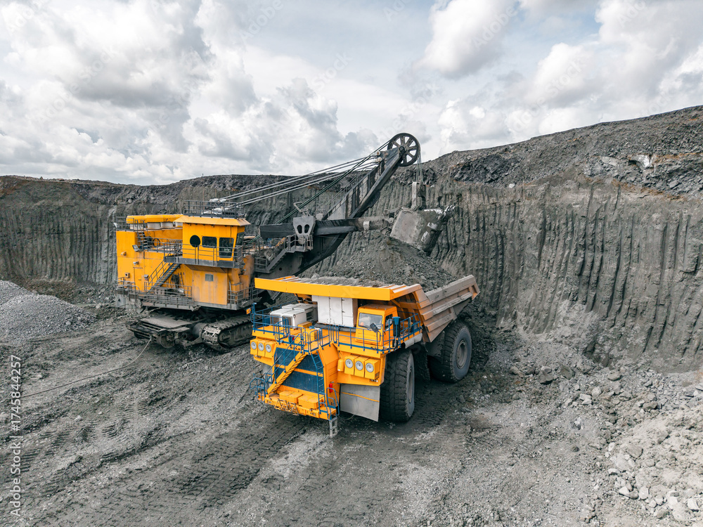 Excavator loading overburden soil into large quarry truck Aerial view. Industrial coal deposit development, machinery at open pit mine extracting resources.