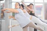 Spirited senior woman mastering arabesque at barre while participating in ballet class designed for adult beginners in modern fitness studio, enhancing well-being and social connections..
