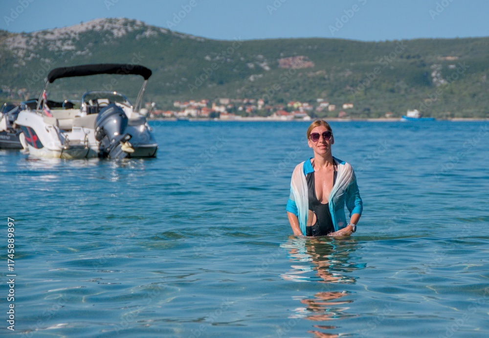 beautiful slender girl in a wet black swimsuit and beach shirt in the water on the beach on the seashore against the background of boats