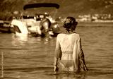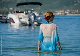 beautiful slender girl in a wet black swimsuit and beach shirt in the water on the beach on the seashore against the background of boats