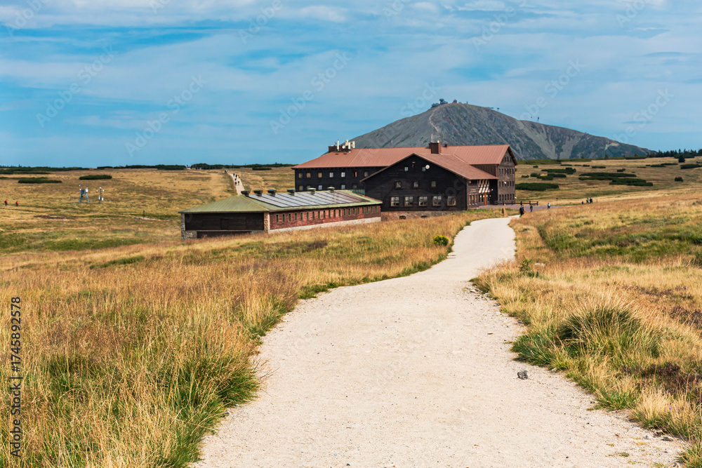 Czeskie Karkonosze - widok na hotel Lucni Bouda i szczyt Śnieżki