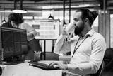 Employee sipping coffee while he reviews analytics and KPI metrics on monitor, driving business strategy and maintaining a professional mindset focused on objectives and success.