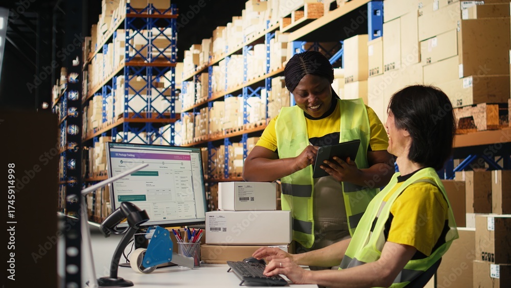 Satisfied coworkers sharing a high five after successful order processing, feeling proud of their teamwork in the industrial retail facility. Fulfillment center employees in workwear. Camera A.