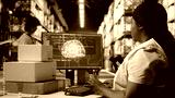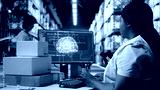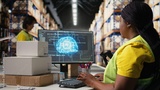 Young woman scanning barcodes with AI automation systems to handle warehouse operations, managing tracking software service. Shipment details on labels in busy distribution hub. Camera A.