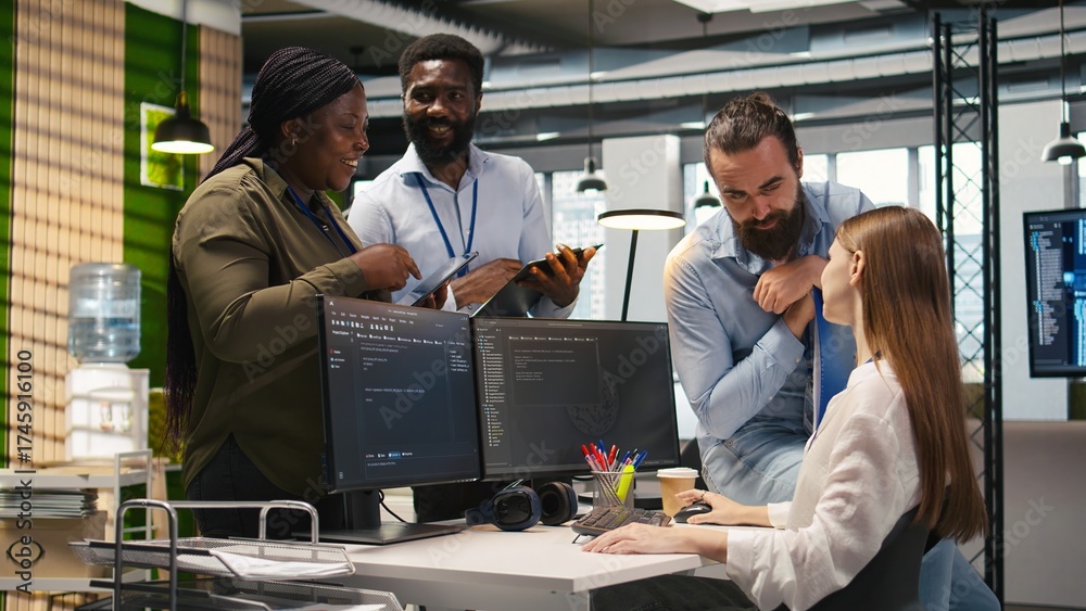 Startup newcomer making friends in office, learning how to use machine learning tech. Upbeat young girl in workplace chatting with coworkers while using AI predictive models, camera A