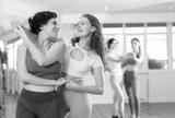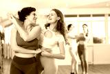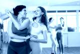 Two enthusiastic young women enjoying in brightly-lit dance studio, energetically moving to rhythm of salsa as dance partners..