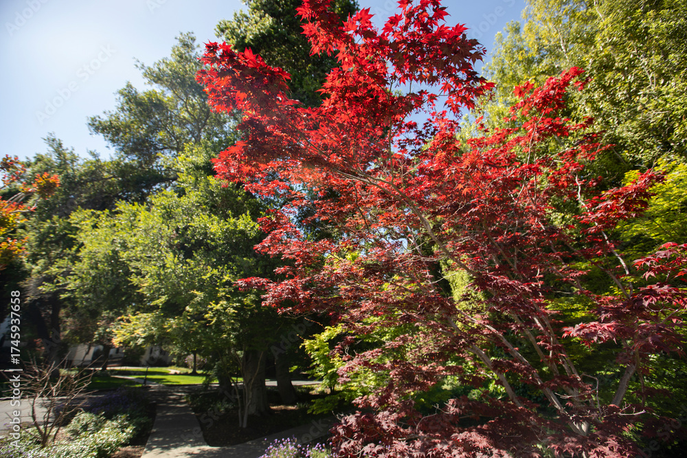 Daylight shines on lush park foliage in the town of Atherton, California, USA.