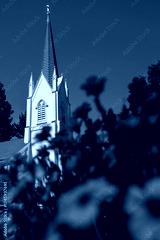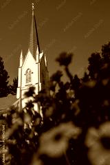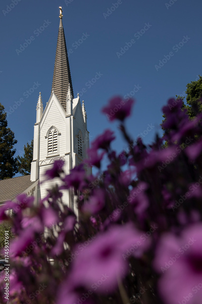 Daylight shines on lush foliage and historic church in the town of Atherton, California, USA.