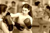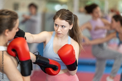 Female co-participant and woman sparring partners during training battle fight using technique of boxing match