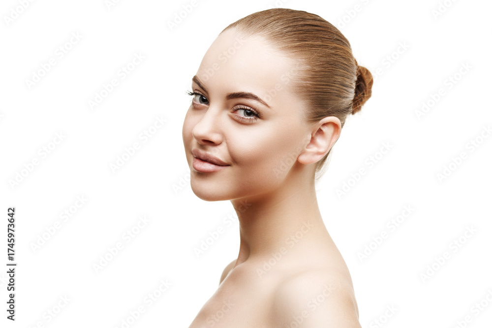 Studio portrait of a young woman with clear skin and natural makeup on a white background. Minimal beauty concept emphasizing healthy skin, elegance, and natural femininity.