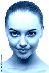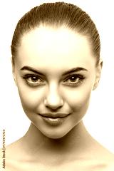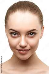Studio portrait of a young woman with clear skin and natural makeup on a white background. Minimal beauty concept emphasizing healthy skin, elegance, and natural femininity.