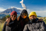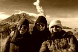 Friends hiking iztaccihuatl volcano with popocatepetl erupting