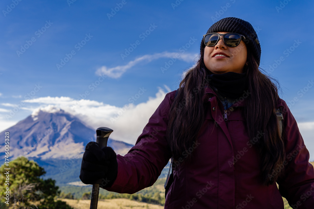 Woman hiking iztaccihuatl volcano with popocatepetl in background