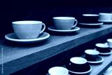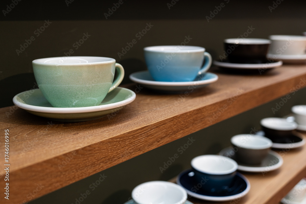 A row of colorful ceramic coffee cups displayed on a wooden shelf. coffee culture, interior design, or café lifestyle themes.