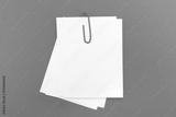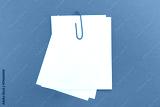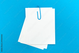 Sheets of white paper, fastened with a paper clip on a blue background. Mock up.