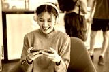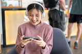 Asian woman holding phone in horizontal playing game watching video while sitting on sofa in cafe.