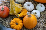 Display of pumpkin and gourd from harvest fair festival with many homegrown and heirloom species that has been organically grown locally for fall and autumn season